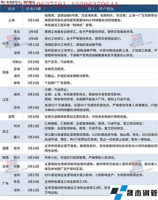據統計,截至3月15日,全國多個省市發布停工停產情況。其中受疫情影響最大的吉林省于3月12日宣布,長春市主要厚壁無縫鋼管倉庫暫停出庫,當地建材市場交投進入暫時停滯狀態,倉庫入庫及本地無縫厚壁鋼管廠家生產暫時正常。深圳市于3月12日宣布,全市范圍內所有建設工地暫定停工排查4天,南山及福田區域厚壁無縫鋼管市場預計共影響需求量約6640噸,深圳全市范圍初步預計共影響建筑厚壁無縫鋼管需求量約6萬噸。與此同時,全國其他地區鋼貿交易也受到影響,部分工地開始停工,物流運輸暫停服務。具體情況如下:
