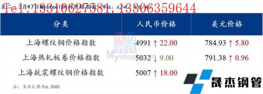 3月17日普鋼絕對(duì)價(jià)格指數(shù)變化:綜合指數(shù)5193.62,上漲21.4;螺紋鋼指數(shù)4950.59,上漲33.42;線(xiàn)材指數(shù)5281.15,上漲28.96;熱軋板卷指數(shù)5102.03,上漲15.98;冷軋板卷指數(shù)5533.89,上漲16.7;中厚板指數(shù)5151.92,上漲11.47。
