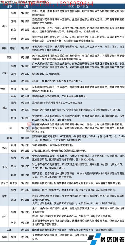 截至3月18日,匯總了15個省份停工停產最新信息。其中,江蘇省內蘇州、常州、連云港以及南京由于疫情原因,無縫厚壁鋼管廠家及市場發貨及物流運輸均受到不同程度的影響。安徽省內出現車輛資源非常緊張,發貨需等待較長時間等情況,無法向南京江寧區發貨,秦淮、溧水、高淳部分地區禁止外省車輛進入。廣東省大部分無縫厚壁鋼管廠家受到物流出貨影響,部分疫情嚴重地級市無法正常配送及發貨,多數無縫厚壁鋼管廠家對于疫情嚴重地區暫停配送。受疫情影響主要無縫厚壁鋼管廠家暫停配送影響比例在三成左右;東莞全市恢復公交、地鐵運營;深圳鹽田區、坪山區等部分區域恢復正常工作秩序。具體情況如下: