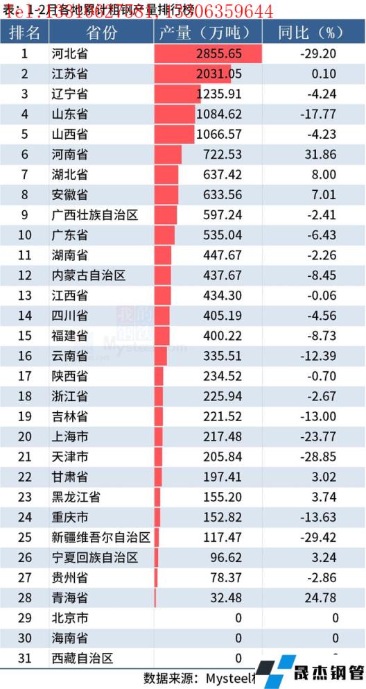 從分省數據來看,有4個省份1-2月粗鋼產量同比降幅超過20%。其中河北降29.20%、上海降23.77%,天津降28.85%和新疆降29.42%。具體情況如下: