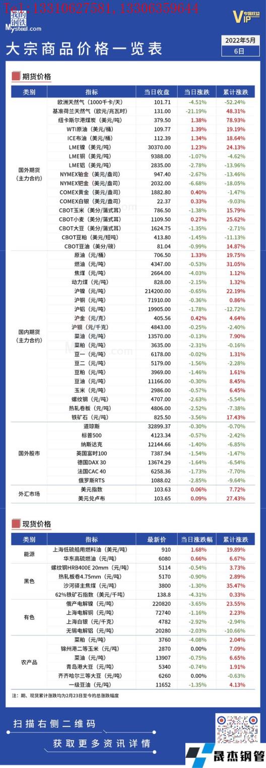 免責聲明:本網(wǎng)站(山東聊城晟杰無縫鋼管廠www.51pvc.cn)刊載的“俄烏局勢丨大宗商品價格一覽表(5月6日)”等均源于網(wǎng)絡,版權歸原作者所有,且僅代表原作者觀點,本文所載信息僅供參考。轉載僅為學習與交流之目的,如無意中侵犯您的合法權益,請及時聯(lián)系刪除。本網(wǎng)站刊登此篇文章并不意味著本站贊同其觀點或證實其內容的真實性,我們不對其科學性、嚴肅性等作任何形式的保證。如果侵犯了您的版權,請盡快聯(lián)系我們予以撤銷,謝謝合作!