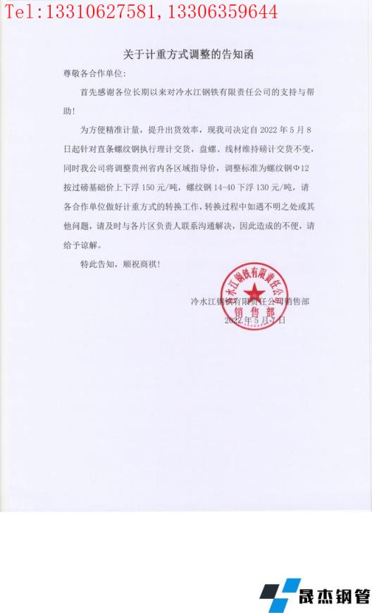 免責聲明:本網站(山東聊城晟杰無縫鋼管廠www.51pvc.cn)刊載的“冷水江鋼鐵有限責任公司關于對貴州區域計重方式調整的告知函”等均源于網絡,版權歸原作者所有,且僅代表原作者觀點,本文所載信息僅供參考。轉載僅為學習與交流之目的,如無意中侵犯您的合法權益,請及時聯系刪除。本網站刊登此篇文章并不意味著本站贊同其觀點或證實其內容的真實性,我們不對其科學性、嚴肅性等作任何形式的保證。如果侵犯了您的版權,請盡快聯系我們予以撤銷,謝謝合作!