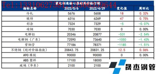 截止2022年5月6日,各原材料當(dāng)日即時(shí)價(jià)格以及價(jià)格周環(huán)比情況如下:
