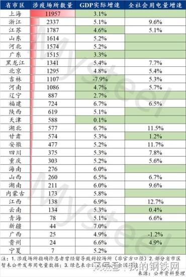表1.截至5月7日全國省份涉疫場所數量與一季度GDP、用電量增速排名