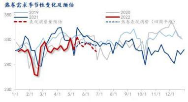 4月下旬開始海外熱卷的緊張程度有所緩解,一方面,西歐對于高價格的承受能力有限,導致了市場的投機情緒有所下降;另一方面,俄烏資源也恢復了一部分出口,使得緊張的情況有所緩解。目前歐洲對于我國的懲罰性關稅和反補貼稅依然較高,當地在購買時首選依然不是我國,所以對于剛需而言,西歐并不在我國鋼鐵出口的范圍內。從6-7月船期的情況看,環比下降的情況概率較大,預計在-15%~-20%的水平。下降完以后,國內外比價依然存在,所以大致可以判斷,出口量會有所維持,但高點已現,預期每個月量在100-120萬噸水平。