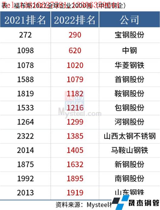 免責聲明:本網站(山東聊城晟杰無縫鋼管廠www.51pvc.cn)刊載的“中國12家鋼企上榜福布斯2022全球企業2000強”等均源于網絡,版權歸原作者所有,且僅代表原作者觀點,本文所載信息僅供參考。轉載僅為學習與交流之目的,如無意中侵犯您的合法權益,請及時聯系刪除。本網站刊登此篇文章并不意味著本站贊同其觀點或證實其內容的真實性,我們不對其科學性、嚴肅性等作任何形式的保證。如果侵犯了您的版權,請盡快聯系我們予以撤銷,謝謝合作!