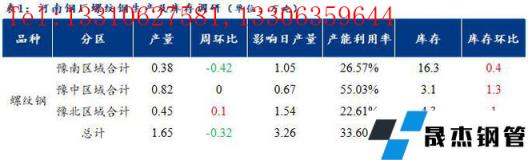 1、調研數據顯示,統計的河南地區10家建筑厚壁無縫鋼管樣本無縫厚壁鋼管廠家中,河南省建材無縫厚壁鋼管廠家螺紋鋼日產量1.65萬噸;檢修/限產影響建材日產量為3.26萬噸,產能利用率為33.6%,較上周下降6.52%。