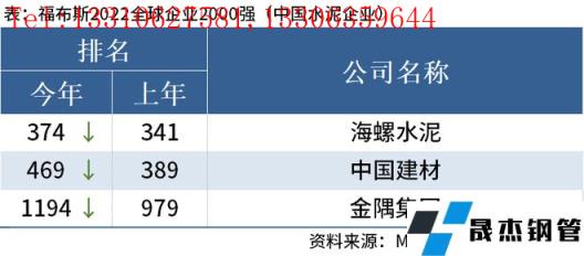 免責聲明:本網站(山東聊城晟杰無縫鋼管廠www.51pvc.cn)刊載的“中國3家水泥企業上榜福布斯2022全球企業2000強”等均源于網絡,版權歸原作者所有,且僅代表原作者觀點,本文所載信息僅供參考。轉載僅為學習與交流之目的,如無意中侵犯您的合法權益,請及時聯系刪除。本網站刊登此篇文章并不意味著本站贊同其觀點或證實其內容的真實性,我們不對其科學性、嚴肅性等作任何形式的保證。如果侵犯了您的版權,請盡快聯系我們予以撤銷,謝謝合作!