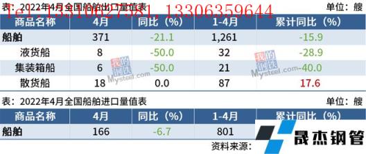4月船舶進(jìn)口166艘,同比減少6.7%;1-4月累計(jì)進(jìn)口801艘,同比增長(zhǎng)6.2%。