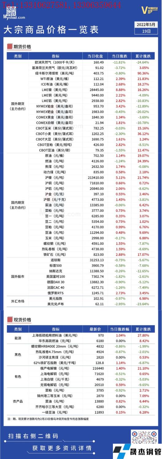 免責聲明:本網站(山東聊城晟杰無縫鋼管廠www.51pvc.cn)刊載的“俄烏局勢丨大宗商品價格一覽表(5月19日)”等均源于網絡,版權歸原作者所有,且僅代表原作者觀點,本文所載信息僅供參考。轉載僅為學習與交流之目的,如無意中侵犯您的合法權益,請及時聯系刪除。本網站刊登此篇文章并不意味著本站贊同其觀點或證實其內容的真實性,我們不對其科學性、嚴肅性等作任何形式的保證。如果侵犯了您的版權,請盡快聯系我們予以撤銷,謝謝合作!
