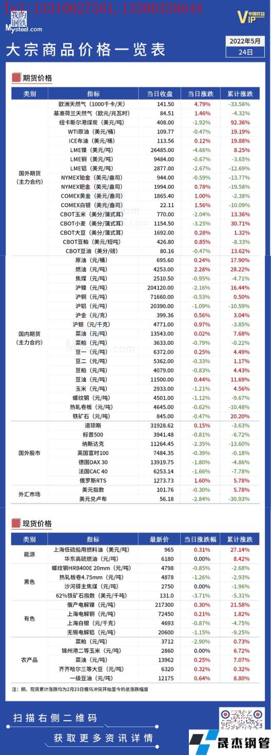 免責聲明:本網站(山東聊城晟杰無縫鋼管廠www.51pvc.cn)刊載的“俄烏局勢丨大宗商品價格一覽表(5月24日)”等均源于網絡,版權歸原作者所有,且僅代表原作者觀點,本文所載信息僅供參考。轉載僅為學習與交流之目的,如無意中侵犯您的合法權益,請及時聯系刪除。本網站刊登此篇文章并不意味著本站贊同其觀點或證實其內容的真實性,我們不對其科學性、嚴肅性等作任何形式的保證。如果侵犯了您的版權,請盡快聯系我們予以撤銷,謝謝合作!