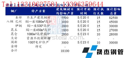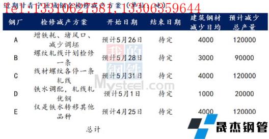 據不完全統計,截至5月25日,國內14家無縫厚壁鋼管廠家發布檢修計劃。其中,徐鋼鋼鐵集團計劃25日對2120m3高爐進行為期7-8天停產檢修計劃,日均影響產量0.8萬噸。
