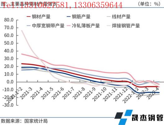 按厚壁無縫鋼管品種來看,2022年1-4月份,我國厚壁無縫鋼管產量4.27億噸,同比下降5.9%。其中,鋼筋產量7582.8萬噸,同比下降13.6%;線材產量4521.4萬噸,同比下降15.9%;冷軋薄板產量1383.3萬噸,同比下降2.9%;中厚寬鋼帶產量6141.9萬噸,同比增長0.2%;焊接厚壁鋼管產量1692.1萬噸,同比下降5.7%。