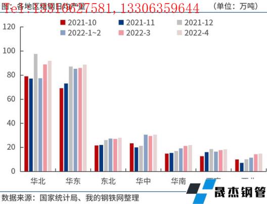 按地區來看,2022年1-4月份,華北地區粗鋼產量1.06億噸,同比下降12.8%;華東地區粗鋼產量1.04億噸,同比下降11.7%;東北地區粗鋼產量3231.6萬噸,同比下降6.3%;華中地區粗鋼產量3325.7萬噸,同比下降5.7%;華南地區粗鋼產量2460.8萬噸,同比下降4.0%;西南地區粗鋼產量2062.2萬噸,同比下降15.9%;西北地區粗鋼產量1564.5萬噸,同比下降0.6%。