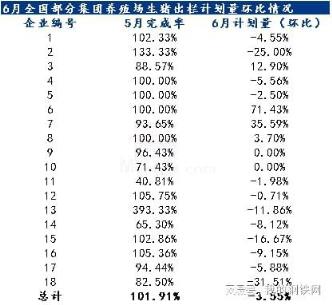 據農產品調研了解,針對18家集團養殖場全國生豬出欄情況來看,5月生豬出欄完成率總計101.91%,6月出欄量較5月實際出欄量環比下跌3.55%。