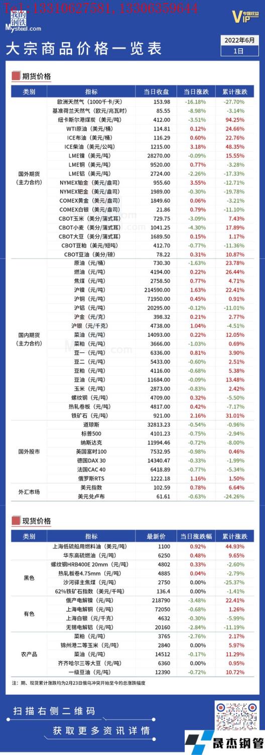 免責聲明:本網站(山東聊城晟杰無縫鋼管廠www.51pvc.cn)刊載的“俄烏局勢丨大宗商品價格一覽表(6月1日)”等均源于網絡,版權歸原作者所有,且僅代表原作者觀點,本文所載信息僅供參考。轉載僅為學習與交流之目的,如無意中侵犯您的合法權益,請及時聯系刪除。本網站刊登此篇文章并不意味著本站贊同其觀點或證實其內容的真實性,我們不對其科學性、嚴肅性等作任何形式的保證。如果侵犯了您的版權,請盡快聯系我們予以撤銷,謝謝合作!