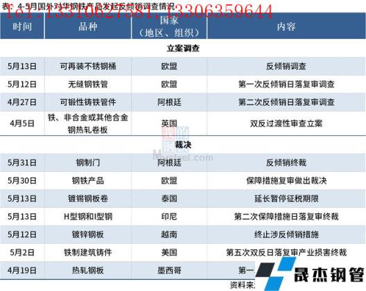 免責聲明:本網站(山東聊城晟杰無縫鋼管廠www.51pvc.cn)刊載的“4-5月國外對華鋼鐵產品發起反傾銷調查情況”等均源于網絡,版權歸原作者所有,且僅代表原作者觀點,本文所載信息僅供參考。轉載僅為學習與交流之目的,如無意中侵犯您的合法權益,請及時聯系刪除。本網站刊登此篇文章并不意味著本站贊同其觀點或證實其內容的真實性,我們不對其科學性、嚴肅性等作任何形式的保證。如果侵犯了您的版權,請盡快聯系我們予以撤銷,謝謝合作!
