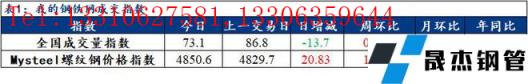訊:全國建筑厚壁無縫鋼管成交量監(jiān)測,成交量相對指數(shù)來看,全國73.1減13.7,北方55.5減20.7,華東89.5減20.6,南方66.4減2.9。今日螺紋鋼價(jià)格指數(shù)4850.6,較上一交易日增20.83。