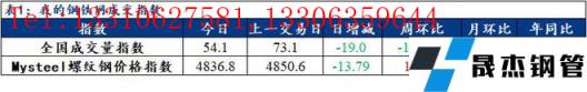 訊:全國建筑厚壁無縫鋼管成交量監(jiān)測,成交量相對指數(shù)來看,全國54.1減19,北方41減14.5,華東68.9減20.6,南方46.4減20。今日螺紋鋼價格指數(shù)4836.8,較上一交易日減13.79。