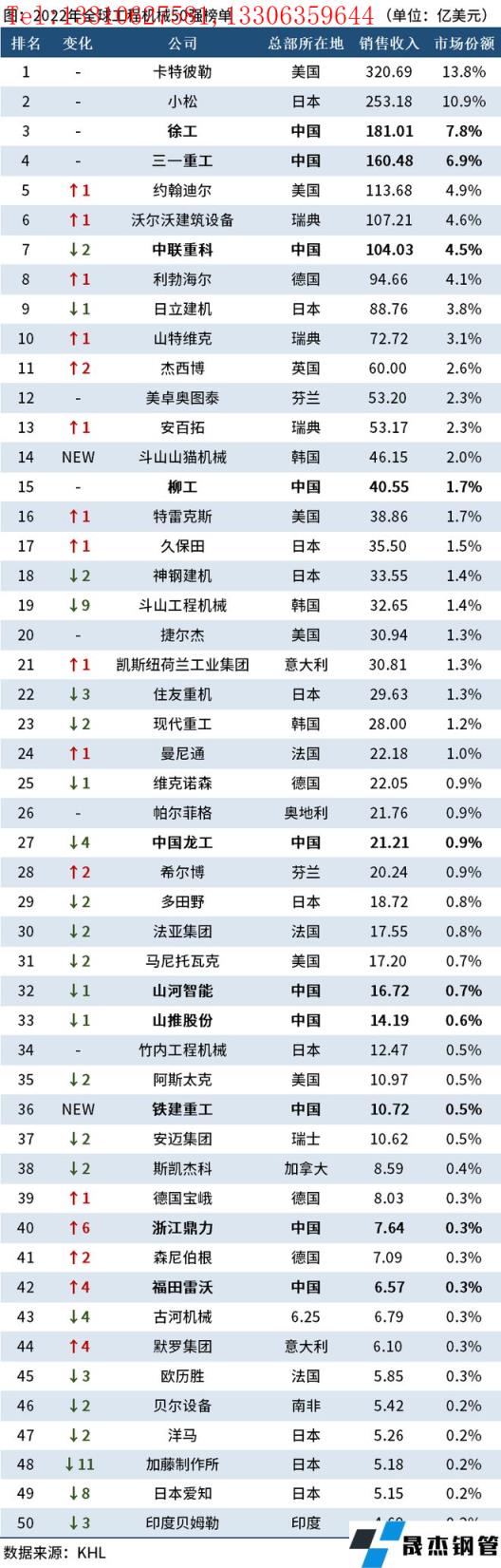 免責聲明:本網站(山東聊城晟杰無縫鋼管廠www.51pvc.cn)刊載的“2022全球工程機械50強榜單出爐,企業銷售額增超20%”等均源于網絡,版權歸原作者所有,且僅代表原作者觀點,本文所載信息僅供參考。轉載僅為學習與交流之目的,如無意中侵犯您的合法權益,請及時聯系刪除。本網站刊登此篇文章并不意味著本站贊同其觀點或證實其內容的真實性,我們不對其科學性、嚴肅性等作任何形式的保證。如果侵犯了您的版權,請盡快聯系我們予以撤銷,謝謝合作!