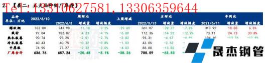 本周總庫存近五周首次累增,其中無縫厚壁鋼管廠家庫存環比持續下降,社會庫存環比擴張;目前無縫厚壁鋼管廠家庫存持續下降的原因仍然在于無縫厚壁鋼管廠家加快庫存前移操作,市場備庫降低廠庫壓力。而社會庫存本周環比明顯累增,主因在于本周廣東、四川、云南、重慶、湖南等省出現連續性降水,以及端午假期和全國性高考,導致運輸不暢,城市工程建設限制,進而使得交易氛圍不佳,社庫出現累增。短期來看,伴隨臨時性因素影響程度減弱后,采購情緒會有小幅恢復。但是臨近淡季,需求不佳已是事實,不排除庫存仍有累增,但增幅或低于預期。