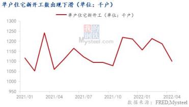 而房貸利率的飛速上漲,使得消費者的購買欲望隨之下降。再疊加美國房價居高不下,4月現有房屋銷售中位數價格同比去年上漲14.8%至391200美元,創1999年以來新高,導致房屋銷售和單戶新開工數量均出現下滑。截至4月,單戶新開工數量為110萬,已連續兩月下降,較今年2月下降9%。