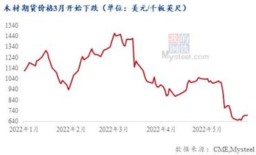 美國木材價格與房市高度相關,隨著消費者對房地產的購買意愿下降,木材價格也隨之降溫。美國木材期貨價格從今年三月初的高點開始下落,截至5月底,木材期貨價格下降765至700美元/千板英尺。