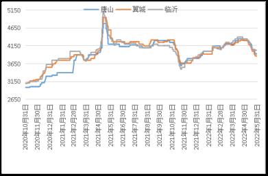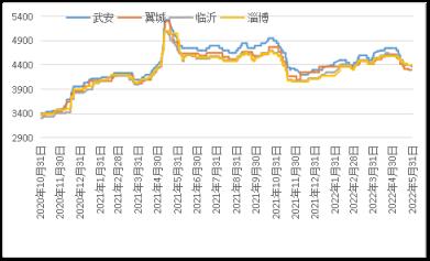 據(jù)云商平臺監(jiān)測數(shù)據(jù)顯示,截至5月31日,煉鋼生鐵天津地區(qū)報價3910元(噸價,下同),較月初跌360元;唐山地區(qū)報價3930元,較月初跌370元;翼城地區(qū)報價3870元,較月初跌440元;臨沂地區(qū)報價4030元,較月初跌320元(詳見圖2)。