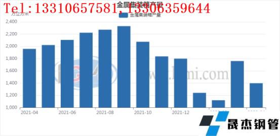 國內下游產品供應分品種來看,4月份國內金屬集裝箱產量為1398.4萬立方米,環比3月份增產約363.3萬立方米。同比21年同期下降約561.9萬立方米。