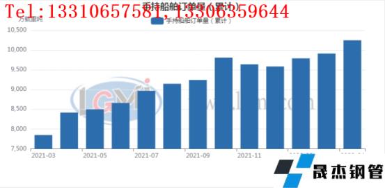 4月份國內手持船舶訂單量累計為10247萬載重噸,環比3月份增長約337萬載重噸。同比21年同期增加約1828萬載重噸。