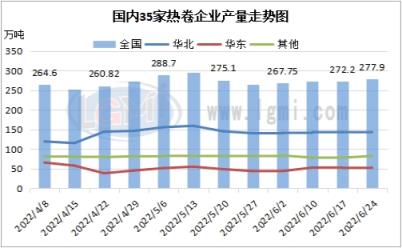 六月份無縫鋼管廠家熱卷產(chǎn)量有所增加,累庫情況有所加重。據(jù)云商平臺監(jiān)測數(shù)據(jù)顯示,截止6月24日,全國35家樣本鋼企熱卷周產(chǎn)量為277.9萬噸,較5月底增加12.6萬噸。全國35家樣本鋼企熱卷廠內(nèi)庫存為88.21萬噸,較5月底增加23.71萬噸。