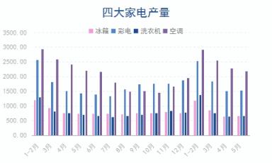1-5月份,冰箱產量3401.0萬臺,同比下降8.1%;彩電產量7441.0萬臺,同比增長4.5%;洗衣機產量3471.7萬臺,同比下降4.1%;空調產量9933.5萬臺,同比下降0.8%。