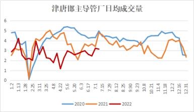 從焊鍍管品種來看,截至6月30日,上半年在統計11家管廠日均出貨量2.69萬噸,同比去年同期下降26.90%,同比2020年同期下降30.49%,其中6月環比上月增長1.32%,上半年高預期、高供應持續發酵,但需求受疫情等影響,持續后延,管廠日均出貨峰值4.2萬,為農歷春節前的冬儲階段。上半年在統計國內各區域貿易商日均出貨量峰值在3月初,均值下滑24.63%,其中6月處于上半年平均日出貨量中線上方水平,較均值增長9.19%,較年內峰值下滑17%。7月價格跌勢超出預期,終端實際需求釋放仍將有限,預計7、8月份仍是一個高庫低需的景象;同時,厚壁鋼管產業鏈虧損程度亦超預期,關注庫存的下降斜率變化。