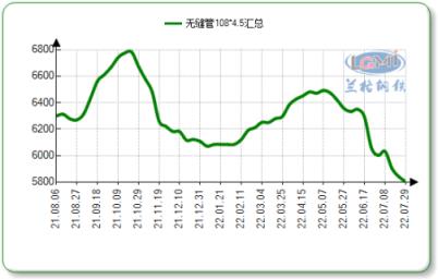 據云商平臺監測數據顯示:截至7月29日,國內十大主導城市108*4.5無縫管市場均價5805元,較上月同期跌205元。