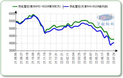 7月末,北方地區無縫鋼管廠家20#熱軋管坯出廠報價4050-4240元,20#連鑄出廠報價3940-4150元;南方地區20#熱軋出廠報價4240-4570元,北方新天鋼、南方東方兩家無縫鋼管廠家熱軋管坯價差維持在190元左右,較7月中旬相比兩者價差有所收窄。受美聯儲加息預期及國內需求持續低迷影響,管坯價格大幅下跌,北方地區熱軋管坯價格跌至3970元,創近一年以來的新低,不過在7月27日筑底后管坯價格呈現小幅上揚走勢。