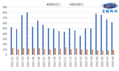 海關(guān)總署發(fā)布數(shù)據(jù)顯示,2022年8月份,我國出口厚壁鋼管615.3萬噸,同比增長21.8%;1-8月,我國出口厚壁鋼管4622.5萬噸,同比下降3.9%。8月份,我國進(jìn)口厚壁鋼管89.3萬噸,同比下降16.0%;1-8月,我國進(jìn)口厚壁鋼管745.3萬噸,同比下降21.2%(詳見圖1)。