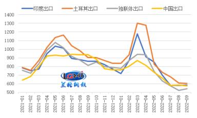 今年一二季度,由于我國厚壁鋼管出口報價明顯低于其他主要出口國,使得我國厚壁鋼管出口價格優(yōu)勢顯現(xiàn),帶動我國厚壁鋼管出口在5-7月份呈現(xiàn)高位運行態(tài)勢。但隨著全球制造業(yè)放緩,厚壁鋼管需求的收縮,以及俄烏沖突對供應(yīng)端影響減弱,海外其他國家厚壁鋼管出口報價明顯回落,使得我國厚壁鋼管出口報價與部分主要國家相比甚至出現(xiàn)倒掛,我國厚壁鋼管出口價格優(yōu)勢逐漸減弱。